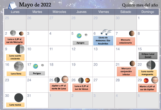Lo que más destacamos es la lluvia de meteoros, las Eta-Acuáridas. El radiante está ubicado en Acuario y la máxima actividad se espera la noche del día 6. Además, si viven en Norteamérica, oeste de África y España no te puedes perder el eclipse lunar total que se producirá la noche del 15 de mayo.