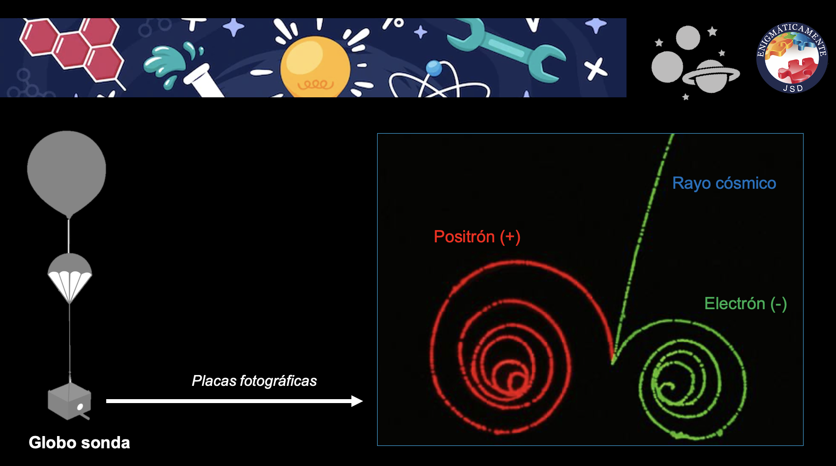 ¿No sería esto un elemento teórico pero ficticio del comportamiento de la materia? En 1932 se realizó un experimento que consistió en enviar globos sonda con placas fotográficas a la alta atmósfera para estudiar la presencia de rayos cósmicos. Se descubrió que había una especie de huellas oscuras divergentes idénticas pero con cargas opuestas (Reeves, 2022). Esto hizo que se descubriese por primera vez la presencia de un electrón y un positrón, formando un par partícula-antipartícula. Tal y como se puede ver en la siguiente ilustración:
